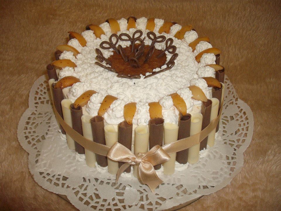A tortalapokat betöltjük a krémmel és kis időre a hűtőbe tesszük dermedni. Közben felverjük a díszítésre szánt tejszínt egy kis porcukorral, a tortát kívül bevonjuk vele, majd körbe illesztjük a csoki rudakat. A tetejét és tetszés szerint díszítjük egy kis baracklekvárral, tejszínnel és csokival.
