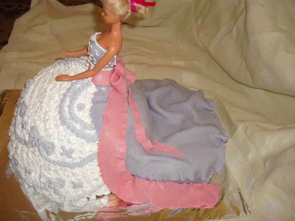 Több, mint 20 szeletes Barbie torta készítése volt a cél, így egy uszály is készült a baba szoknyája mellé, hogy biztosan elég legyen a szülinapozó seregnek. A szoknya egy 24 cm-es és egy 20 cm-es tortalapból készült, míg az uszály egy 20 cm-es piskótából.