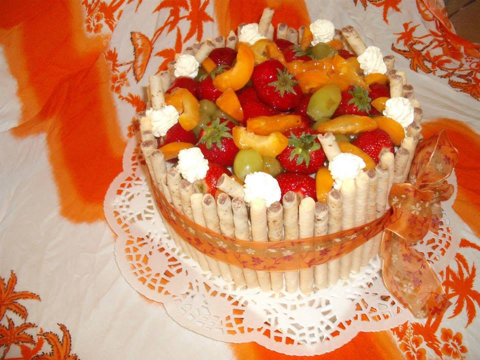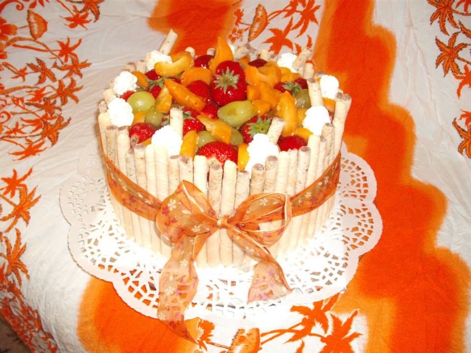 A tortalapokat betöltjük a krémmel, kis időre hűtőbe tesszük dermedni. Kívül is bevonjuk a krémmel, majd az oldalára rakjuk az ostya rudakat.